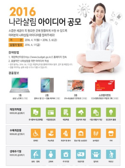 기획재정부는 다음달 6일까지 재정혁신타운 홈페이지를 통해 2016 나라살림 아이디어 공모전을 진행한다고 10일 밝혔다.