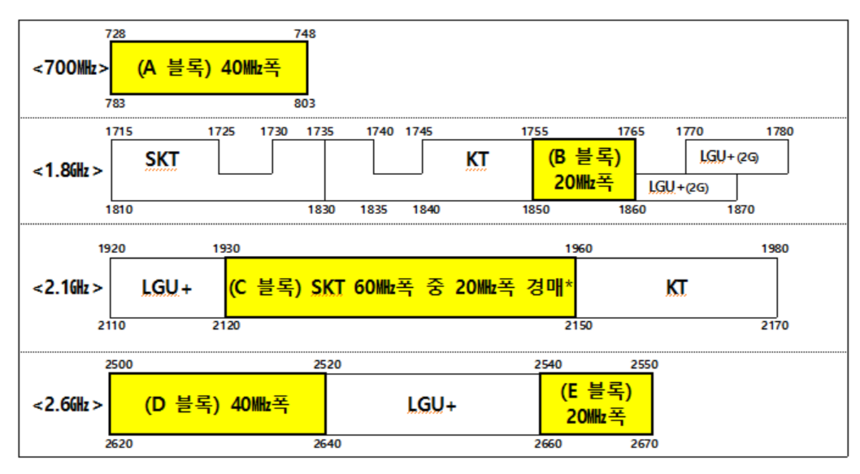 이번 경매 대상 주파수는 현재 LTE망 인접 대역을 포함해 총 5블록이다. 미래부가 정한 최저 가격을 모두 합치면 경매 규모는 총 2조 5000억원에 달한다.