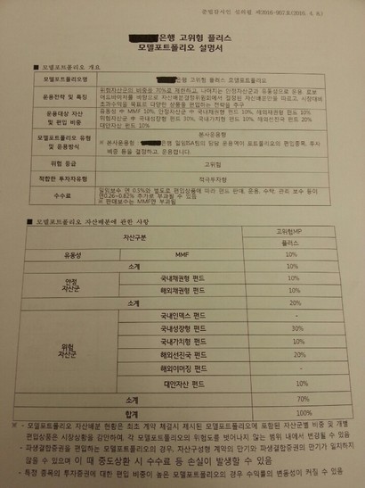 기자는 '파생상품 자격증 미취득' 직원의 상담에 따라 투자성향 질문지를 작성해야 했다. 초저위험군에 속하는 투자 성향이 나오자 직원은 "예금 하는 것이 낫겠다"며 "차라리 고위험 등에 투자한 뒤 수익률을 확인하며 위험 단계를 낮춰도 된다"고 말했다. 이 자리에서 기자는 고위험·중위험 모델포트폴리오 설명서를 들고 투자 상담을 받았다.