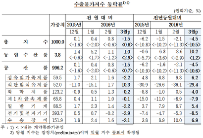 한국은행이 12일 발표한 2016년 3월 수출입물가지수에 따르면 지난달 수출물가지수(잠정치)는 80.72로 올해 2월 81.96보다 1.5% 하락했다. 수출물가지수는 지난해 12월 0.1% 오른 이후 계속 상승하다가 4개월만에 떨어졌다.